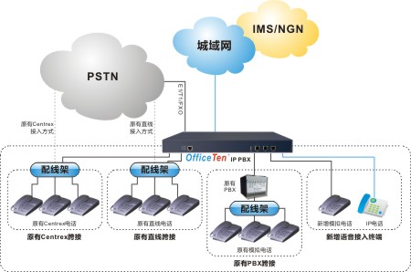 目前有大量客户已有运营商的接入线路,因为资费等原因想接入其它运营商,但又想保留原有运营商的号码,这种情况下就需要使用跨接功能。OfficeTen接入设备可实现对虚拟网、直线、原有PBX的跨接。